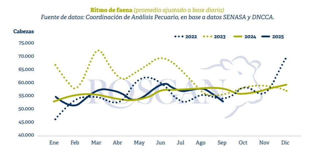 Lo cierto es que los datos anticipados por el ritmo de traslado de animales a plantas de faena ya han sido confirmados oficialmente, registrándose una faena de 1.169.120 cabezas en todo el mes. Si bien, en números absolutos, esta cifra representa prácticamente la misma cantidad de animales faenados en agosto, al llevarla a una base diaria —ajustada por la cantidad de días hábiles computables en cada período mensual— se observa una caída significativa: 8,3 % en relación con el mes previo y 7,7 % respecto de lo registrado un año atrás.
