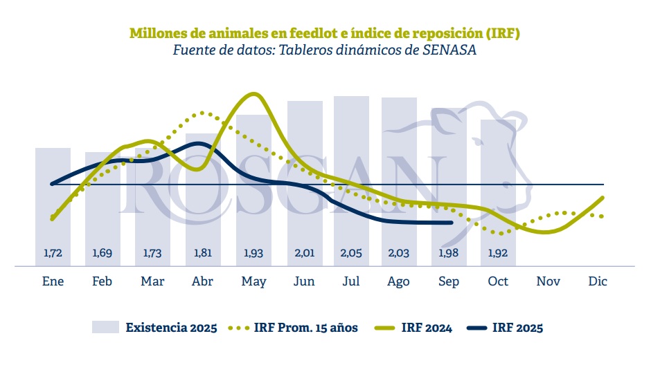 Al 1° de octubre, los datos informados por SENASA confirman existencias por un total de 1.915.612 vacunos, un 3% menos que lo reportado el mes pasado, siendo este el tercer mes consecutivo en fase de vaciado. En concreto, durante el último mes, los corrales recibieron un total de 337.100 vacunos, al tiempo que registraron egresos por 442.442 animales, lo que refleja un Índice de Reposición de 0,76, un cociente muy similar al registrado en agosto.